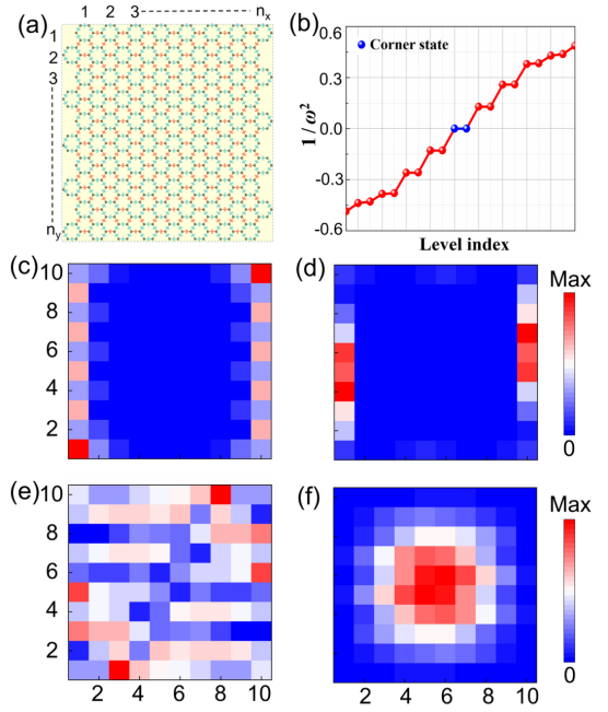工作系统研究了一维半无限长电路和零维具有开放边界条件的有限大电路,在二者中分别发现了能隙非常小的边缘态和无能隙角落态,且该角落态的拓扑起源是非零的体四极矩,而不是由边缘偶极极化引起的瓦尼尔类角落态。同时,通过对体系电压分布的计算,发现电路的拓扑态能够通过外加输入的激励频率来灵活调控。当电路处于共振频率时,体系的两点电阻会在角落处出现一个极大的共振峰,为实验观察提供了一个极大的利好(图2)。在电路的实际应用时,不可避免地会出现器件参数的误差,该工作发现此电路对于一定程度内的误差具有良好的鲁棒性,拓扑态在该范围内不受影响,且电路的尺寸也可以做到很小而不导致拓扑态消失。这些发现对于未来拓扑电路实际研究和应用有重要的指导意义。