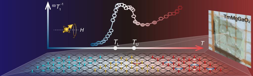 示意图(前)二维量子磁体TMGO的有限温度相图及其对应自旋位形,蓝色与红色三角形分别代表破坏“三角形规则”(即自旋指向两上一下或两下一上)的涡旋与反涡旋,(右)TMGO晶体示意,和(后)自旋-晶格驰豫率1/T1结果,TL~0.9K和TU~1.9K之间的平台揭示了两次BKT相变和中间温度区间浮动BKT相的存在。
