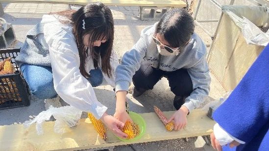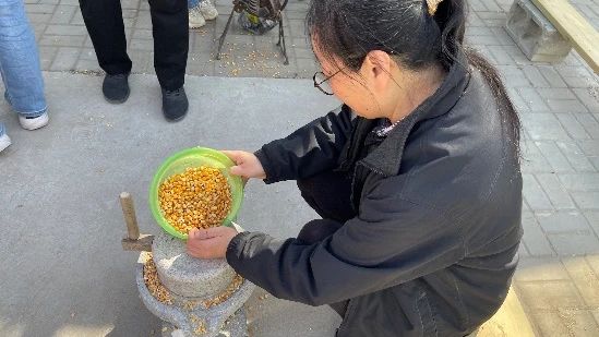 为了更深入地了解农业生产过程,女教师们还亲自尝试了玉米脱粒的过程。他们戴上手套,端起玉米棒,一遍又一遍地尝试着脱粒,最终成功地将玉米脱粒出来。大家被这个简单而又有趣的过程所吸引,收获了对农耕劳动的新认识。