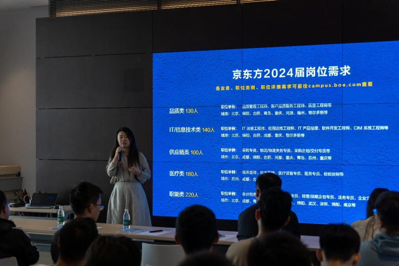 在交流答疑环节,冀玮部长对员工发展空间、公司福利体系等同学们比较关心的问题进行了详细的解答,同时她表示京东方对新入职的校招生设置了长期完善的培养机制、清晰明确的成长路径和科学的薪酬体系,致力于实现对企业员工的全方面保障。