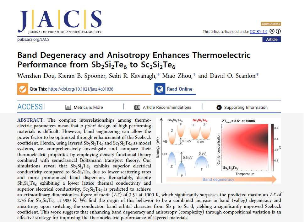 近日,北航best365官方网站登录入口周苗教授与合作者在层状化合物热电材料的理论设计方面取得重要进展,相关成果以“Band Degeneracy and Anisotropy Enhances Thermoelectric Performance from Sb2Si2Te6 to Sc2Si2Te6”为题在《Journal of the American Chemical Society》上发表。