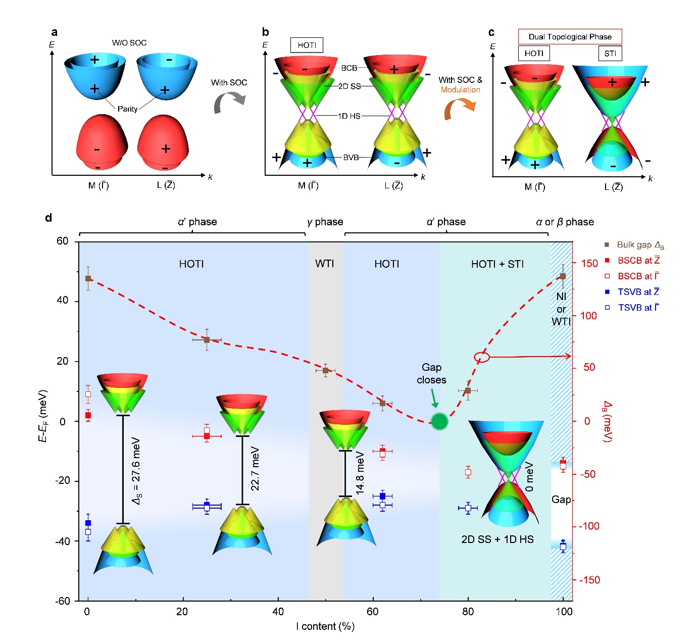 在此项工作中,研究团队利用角分辨光电子能谱、扫描隧道显微镜以及理论计算,研究了一种准一维材料体系——Bi4X4(X=Br,I),通过调控卤族元素Br和I的比例实现多重可控拓扑相变,进一步实现了双重拓扑序共存的拓扑量子材料。在该材料体系中,Bi元素提供强自旋轨道耦合作用,导致其电子结构具有双点双重能带反转(图a-b),产生高阶拓扑量子相。以此为基础,通过Br和I元素掺杂能够实现单点的能带交叉(图c),导致高阶拓扑和强拓扑的复合拓扑态诞生于Br:I摩尔比约2:8的Bi4X4晶体中。