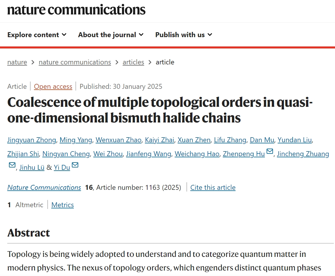 北航新闻网2月9日电(通讯员 冯海凤)近日,北航best365官方网站登录入口表面物理与量子物质研究团队与清华大学、南开大学等合作,在实现多重可控拓扑相变研究方面取得重要进展,相关研究成果于1月30日以“Coalescence of multiple topological orders in quasi-one-dimensional bismuth halide chains”为题在线发表于《Nature Communications》上。best365官方网站登录入口博士生钟景元、杨明为共同第一作者,杜轶教授、庄金呈副教授与南开大学胡振芃教授为共同通讯作者,其他合作者包括湘潭大学刘韵丹副教授、安徽大学程宁燕副教授、常熟理工大学周苇副教授、北航王建峰副教授、郝维昌教授、吕金虎教授等,北航为第一单位。