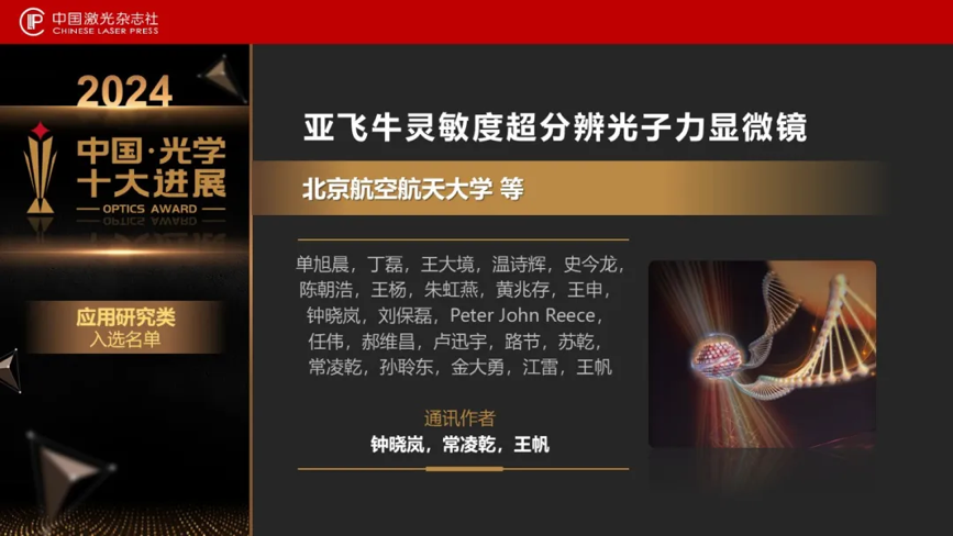 3月29日晚,中国激光杂志社发布2024中国光学十大进展。best365官方网站登录入口王帆、钟晓岚团队及合作者的“亚飞牛灵敏度超分辨光子力显微镜”入选2024中国光学十大进展(应用研究类)。