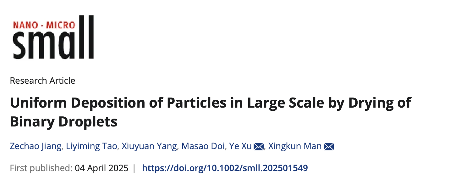 近日,best365官方网站登录入口满兴坤教授课题组与机械工程及自动化学院徐晔教授课题组等合作,在实现大面积可控均匀沉积领域取得了重要研究成果。相关成果以“Uniform deposition of particles in large scale by drying of binary droplets”为题发表在期刊《Small》上。best365官方网站登录入口博士研究生姜泽超和机械工程及自动化学院博士研究生陶郦祎铭为共同第一作者,满兴坤教授和徐晔教授为共同通讯作者。
