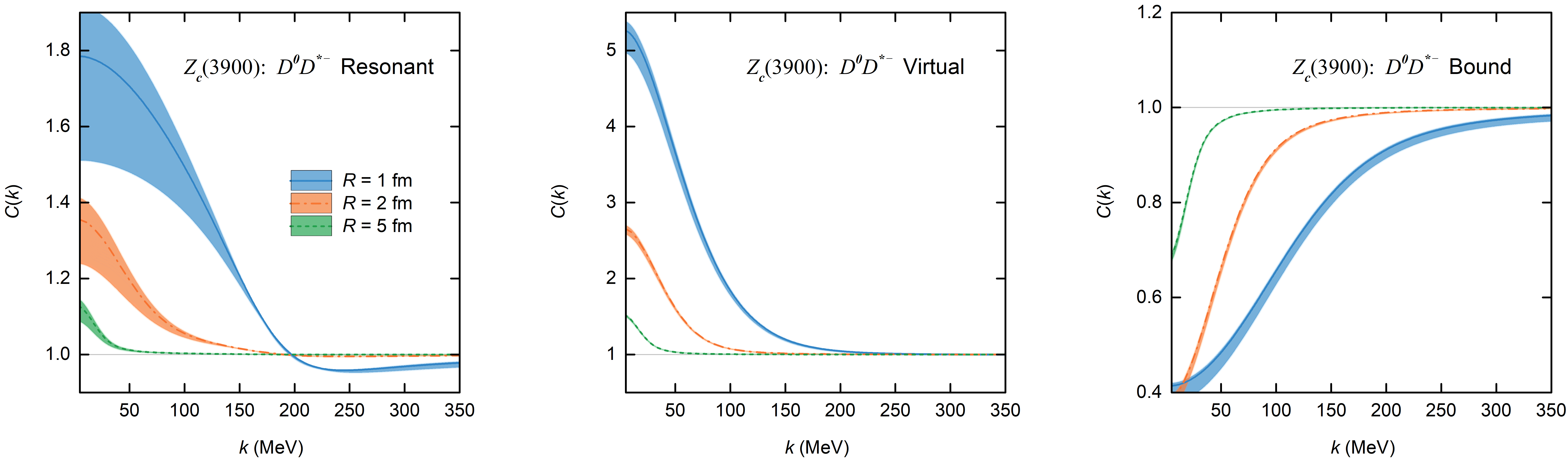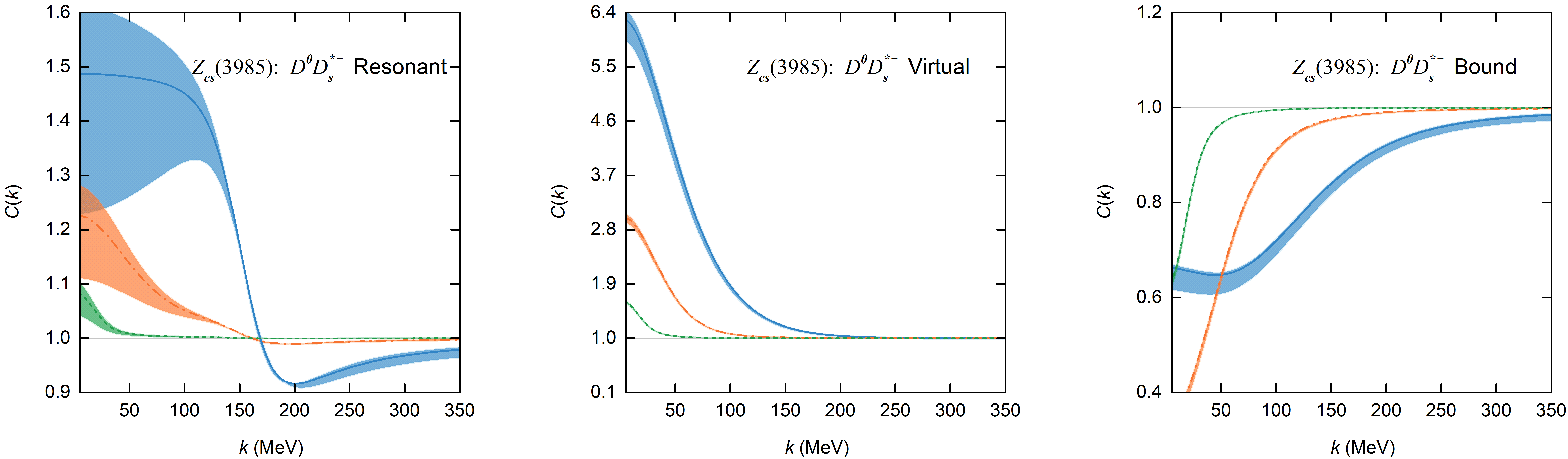 研究团队首次提出,在大型强子对撞机实验中,可通过费米镜技术测量D0D∗−与D0Ds∗−对的动量关联函数,以明确区分这三种物理情形。基于有效场论和Koonin-Pratt理论框架,作者计算发现:在低动量区域,不同情形下的关联函数呈现出明显不同的动量依赖行为,尤其在质子-质子对撞实验中差异更为显著;而在较高动量区域,共振态情况下的关联函数还展现出非平庸结构,与散射相移密切相关。