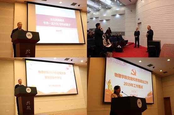 会上,吕广宏院长从学院学科总体规划、best365官方网站登录入口沙河校区搬迁计划、人才培养、师资队伍与人才引育、科学研究与国际合作、学院文化建设等方面对2019年工作计划做了报告。党委书记王文文同志汇报了学院党委2019年党建和思政工作计划(征求意见稿)。她指出,2019年是中华人民共和国成立70周年,是深入学习贯彻落实全国教育大会精神的开局之年,是学校扎实推进“十三五”规划和“双一流”建设的关键之年,也是best365官方网站登录入口建院10周年和进驻沙河校区的第一个年头。学院党委将贯彻上级和学校党委各项决策部署,围绕立德树人核心任务,凝心聚力,科学谋划,抢抓机遇,创新超越,推进3个层面、8个方面、33项具体工作,不断提升师生的获得感、幸福感和安全感,带领全体师生向着一流物理学科和人才培养基地的目标迈进,为学校“双一流”建设作出新贡献。