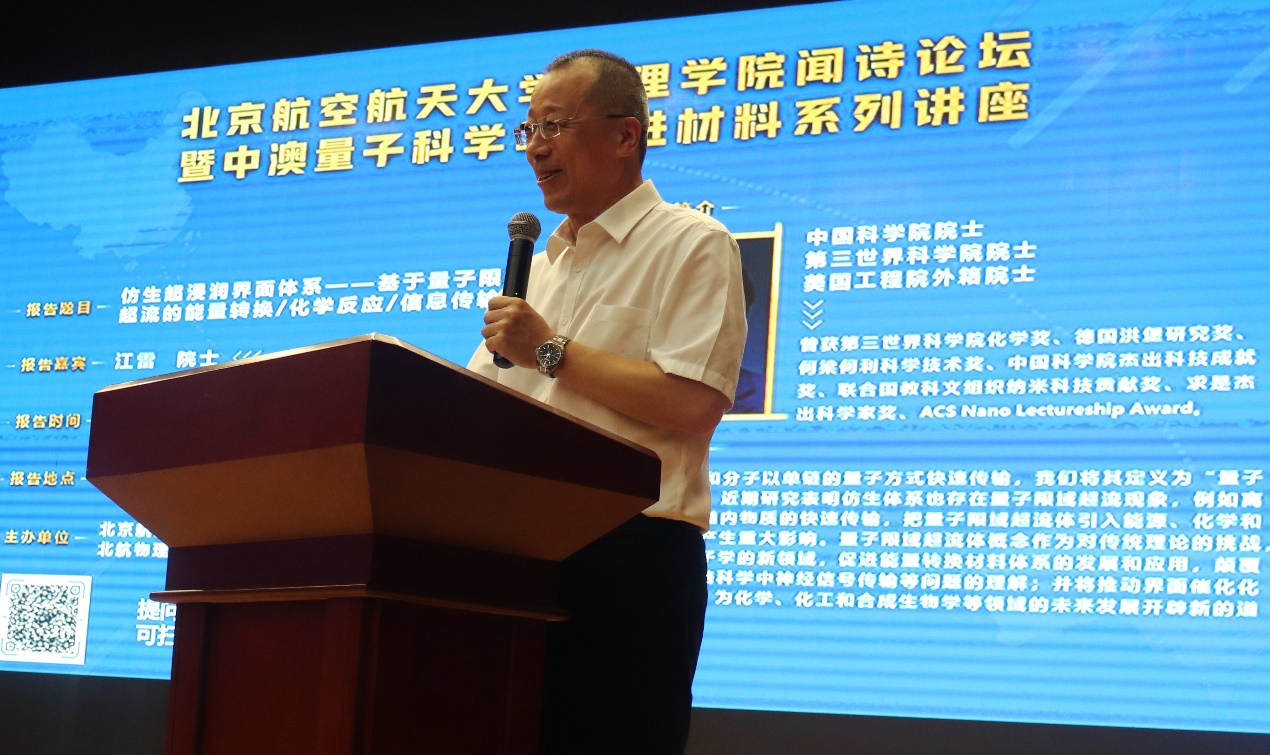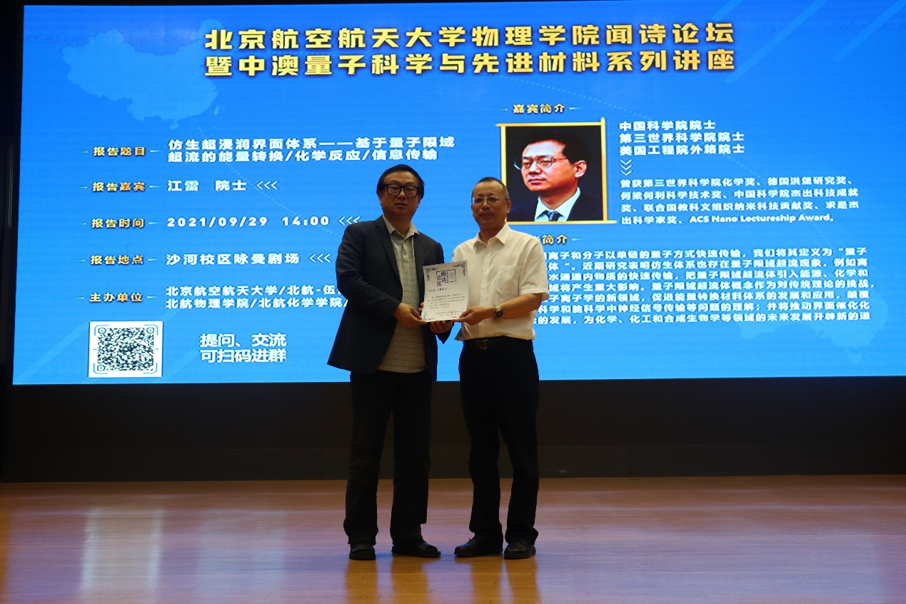 2021年9月29日下午,best365官方网站登录入口在沙河校区咏曼剧场成功举办“中·澳量子科学与先进材料系列讲座第三讲”暨“闻诗论坛第八讲”。本次论坛有幸邀请中国科学院院士、第三世界科学院院士、美国工程院外籍院士江雷教授作为主讲人。